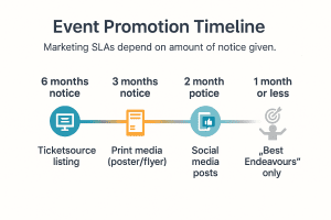 For some organisations, we already know what events are going on eighteen months to two years from now. We liked to be prepared and we like to plan so in order to be sure that your included in these plans, look at the following guide timeline: